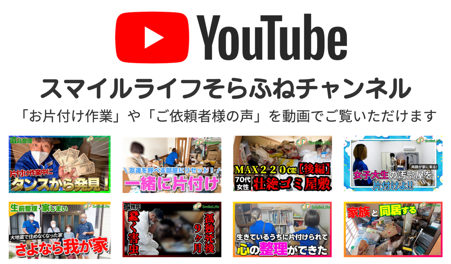 スマイルライフそらふねでは、個人の方からのご依頼の他に、企業・葬儀会社・銀行・不動産管理会社・行政より多くの特殊清掃・遺品整理のご相談を頂いております。